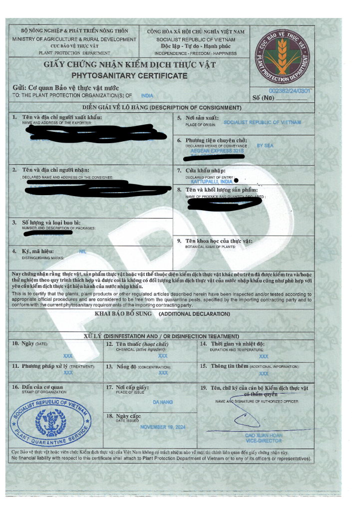 • Tiêu đề: “Phytosanitary Certificate” kèm mã số giấy duy nhất để tra cứu.
