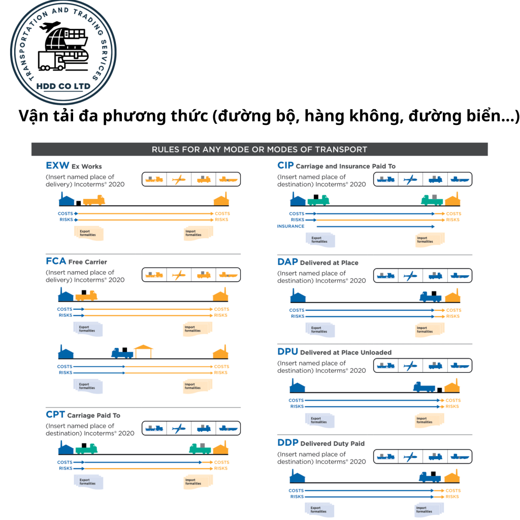 - Vận tải đa phương thức (đường bộ, hàng không, đường biển…): EXW, FCA, CPT, CIP, DPU, DAP, DDP.