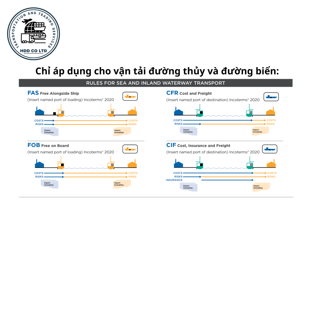 - Chỉ áp dụng cho vận tải đường thủy và đường biển: FAS, FOB, CFR, CIF.